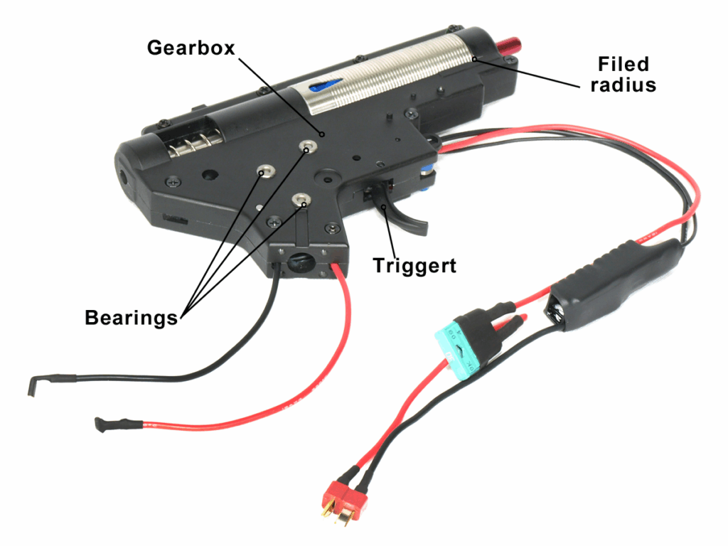 Les répliques AEG fonctionnent grâce à un moteur électrique alimenté par batterie qui entraîne un système de boîte de vitesses contenant trois engrenages principaux (conique, droit et secteur). Ce mécanisme comprime un piston contre un ressort, créant la pression d’air nécessaire pour propulser les billes.