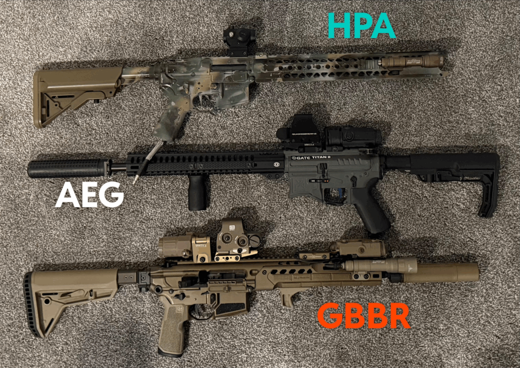 comparaison des plateformes airsoft fusils hpa, aeg et gbbr disposés visuellement pour référence