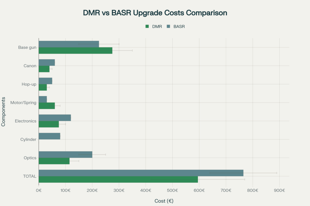R : Budget DMR complet : 420-770€ incluant la base, les mises à niveau essentielles et l’optique, disponibles dans notre sélection airsoft . Budget BASR complet : 700-1150€ pour un build véritablement performant avec tous les composants nécessaires. Ces montants n’incluent pas les accessoires annexes comme l’ équipement de protection et les consommables.