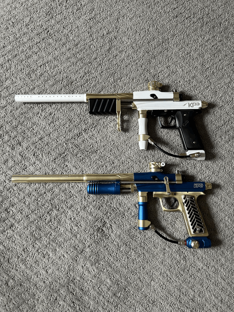 deux marqueurs de pompe de paintball améliorés avec des schémas de couleurs personnalisés et des composants étiquetés kp3 et kpc, illustrant les modifications de la pompe de paintball