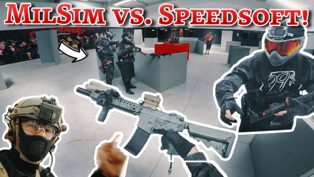 comparaison des équipements et des styles de jeu milsim et speedsoft dans une arène d’airsoft intérieure