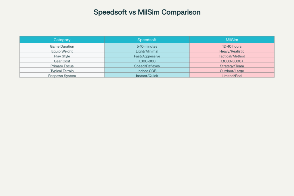 Le speedsoft exige une explosivité et une agilité importantes sur de courtes périodes. Le MilSim nécessite une endurance prolongée et la capacité de porter du poids sur de longues distances.​
