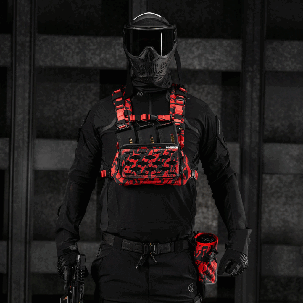 joueur de speedsoft portant un équipement noir léger et une ceinture de poitrine rouge conçue pour un jeu d’airsoft rapide