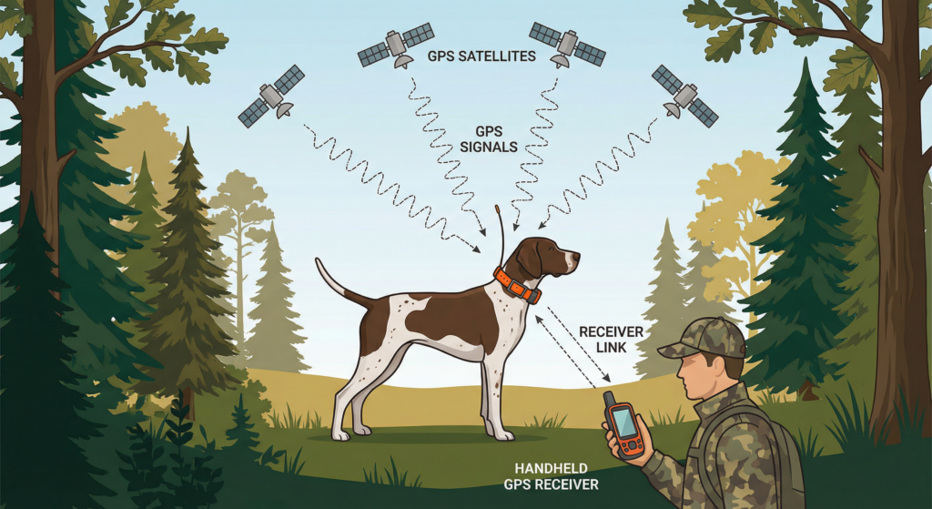 Le principe de fonctionnement repose sur une architecture émetteur-récepteur . Le collier émetteur porté par le chien capte les signaux des satellites GPS pour déterminer sa position précise, puis transmettre ces informations via ondes radio à la télécommande réceptrice portée par le chasseur. La fréquence de mise à jour varie généralement entre 2,5 et 5 secondes , permettant un suivi en temps réel des déplacements du chien.
