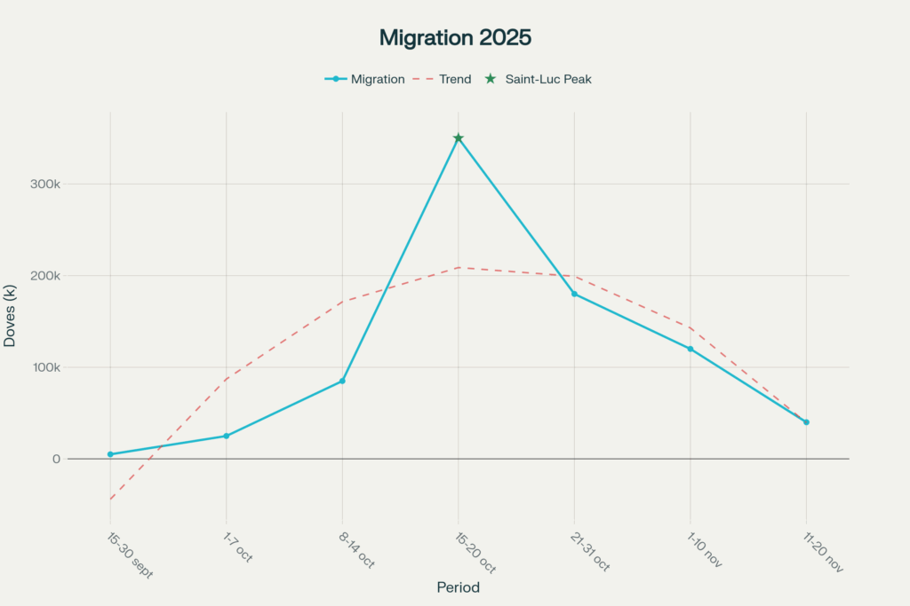Les passages les plus spectaculaires se concentrent entre le 15 et 20 octobre , période de la Saint-Luc . Les conditions idéales combinent un anticyclone stable, des températures fraîches (8-15°C) et des vents de Nord-Est modérés (15-25 km/h). Les matinées brumeuses suivies d’éclaircies vers 10h mettent en évidence les poses dans les palombières.