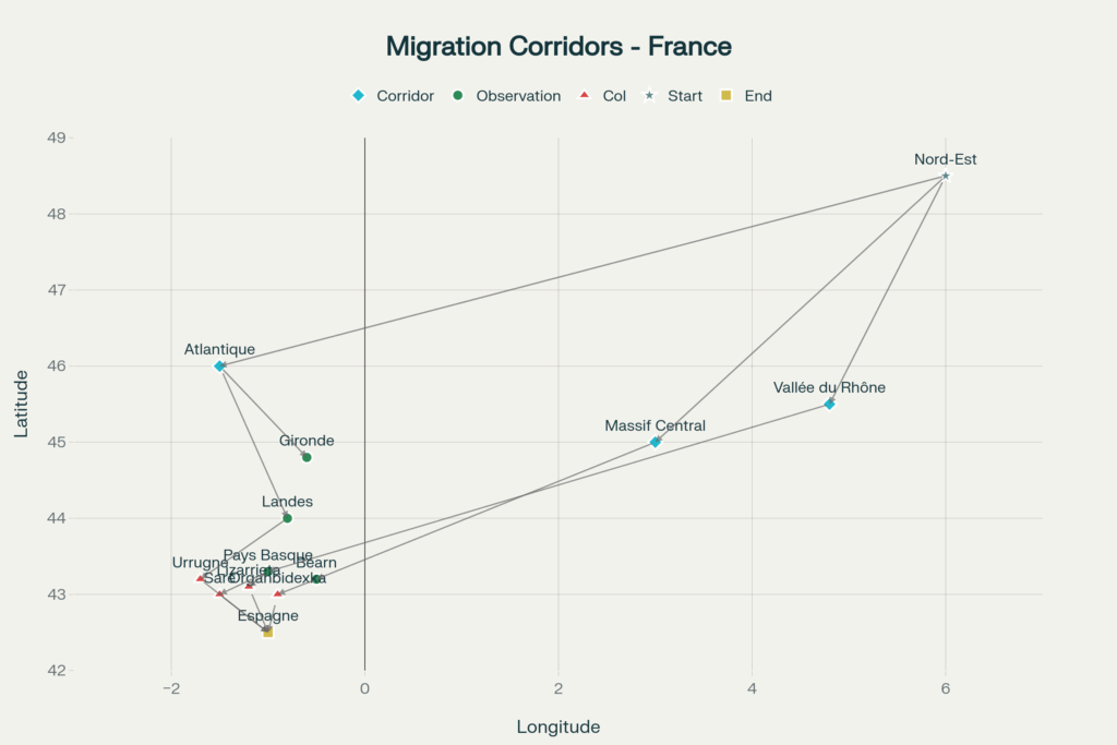 Le couloir atlantique constitue l’axe principal, drainant les populations venues des Pays-Bas , de Belgique et du nord de la France . Les palombes suivent la façade atlantique, traversant successivement la Bretagne , les Pays de la Loire , puis le Poitou-Charentes avant de converger vers les Landes et le Pays Basque . Ce couloir concentre environ 60% des effectifs migrateurs selon les derniers comptages du GIFS (Groupe d’Investigation sur la Faune Sauvage).