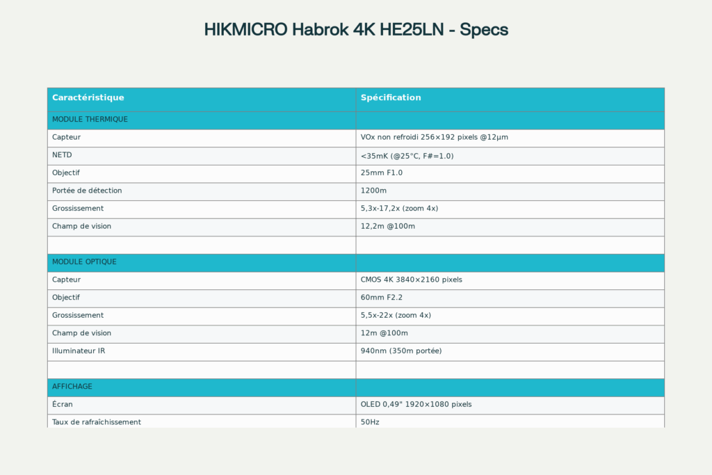 Les jumelles de vision thermique HIKMICRO Habrok 4K HE25LN intègrent une technologie de pointe qui les distingue sur le marché. Le cœur du système repose sur un détecteur thermique VOx non refroidi offrant une résolution de 256×192 pixels avec un pas de 12 microns, garantissant une sensibilité thermique exceptionnelle avec un NETD inférieur à 35mK. Cette configuration permet une détection thermique jusqu’à 1200 mètres, idéale pour le repérage d’animaux ou de personnes dans l’obscurité totale.