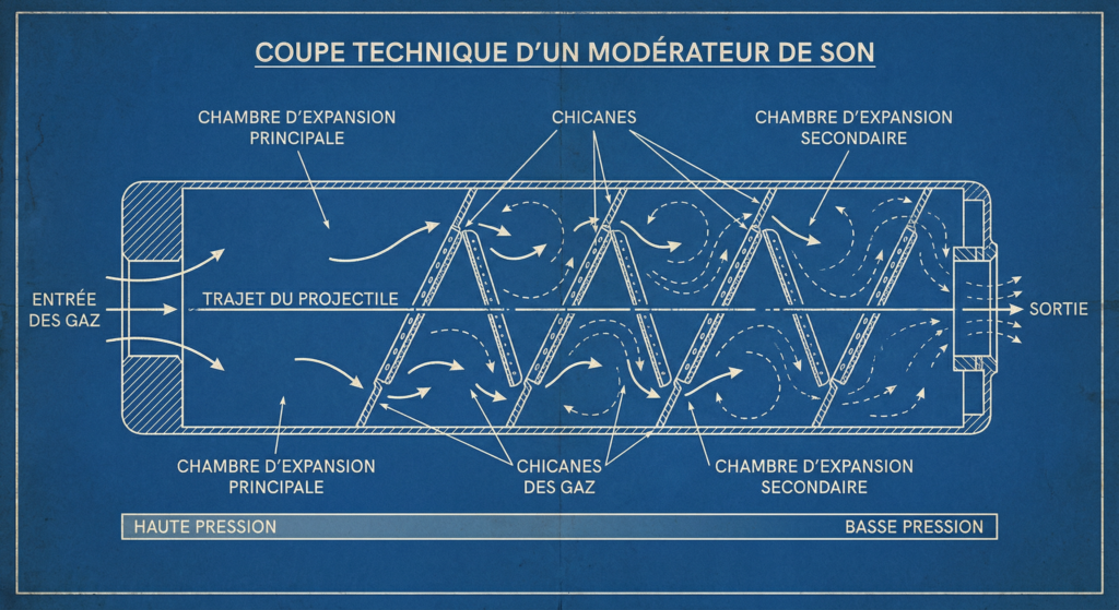 - Absorption de l’onde de bouche : Les chicanes successives créent des chambres d’expansion qui vont ralentir et disperser les gaz avant qu’ils ne quittent le canon