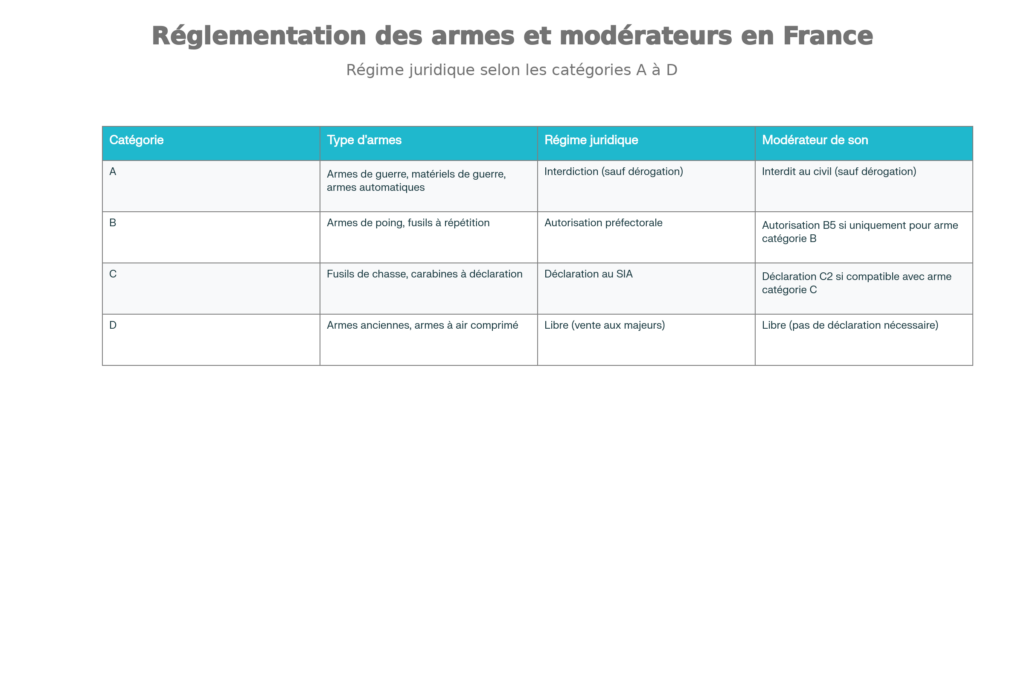 La réglementation des modérateurs de son s’inscrit dans le Code de la sécurité intérieure, qui classe les armes en quatre catégories (A, B, C et D) selon leur dangerosité. Les réducteurs de son suivent le régime juridique des armes auxquelles ils sont destinés.
