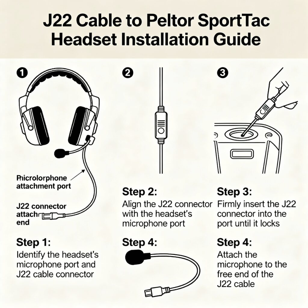 L’installation d’un câble J22 sur un casque Peltor est simple mais nécessite quelques précautions. Le connecteur J22 à double broche se trouve généralement sur le côté droit du casque, protégé par un cache en caoutchouc. Il faut d’abord retirer ce cache, puis insérer délicatement le connecteur du câble en respectant l’orientation indiquée (souvent marqué par un détrompeur).
