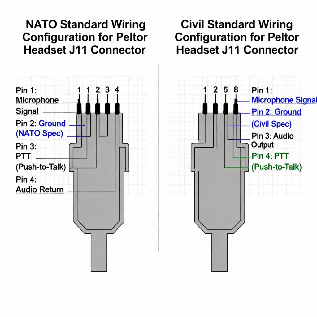 Un aspect crucial souvent méconnu concerne la différence entre le câblage NATO (militaire) et le câblage civil des connecteurs J11. Bien que physiquement identiques, ces deux standards inversent l’ordre des broches pour le microphone et le haut-parleur. Sur un connecteur NATO, utilisé par les casques militaires authentiques comme le ComTac d’origine militaire, l’ordre suit la norme OTAN. En revanche, les versions civiles de casques, y comprennent le Casque 3M Peltor COMTAC VIII avec micro et câble disponible sur Le Montagnard , utilise le standard civil.