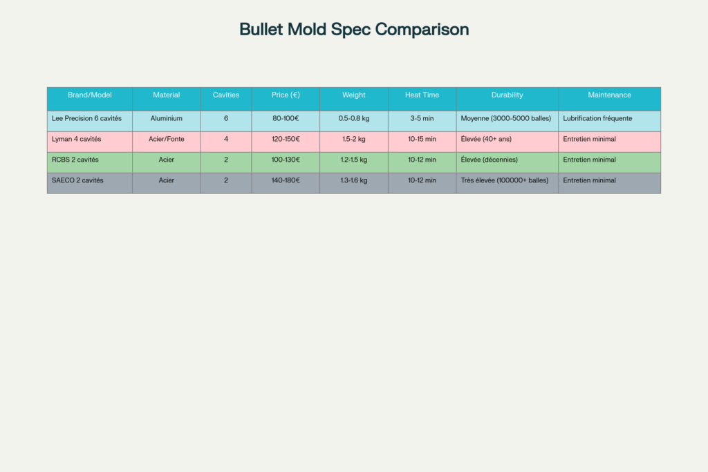 Le marché des moules à balles offre plusieurs alternatives au Lee 6 cavités, chacune avec ses spécificités. Les moules Lyman en acier ou fonte, disponibles en configurations 2 ou 4 cavités, offrent une durabilité supérieure mais à un prix 50% plus élevé et avec un temps de chauffe triplé.