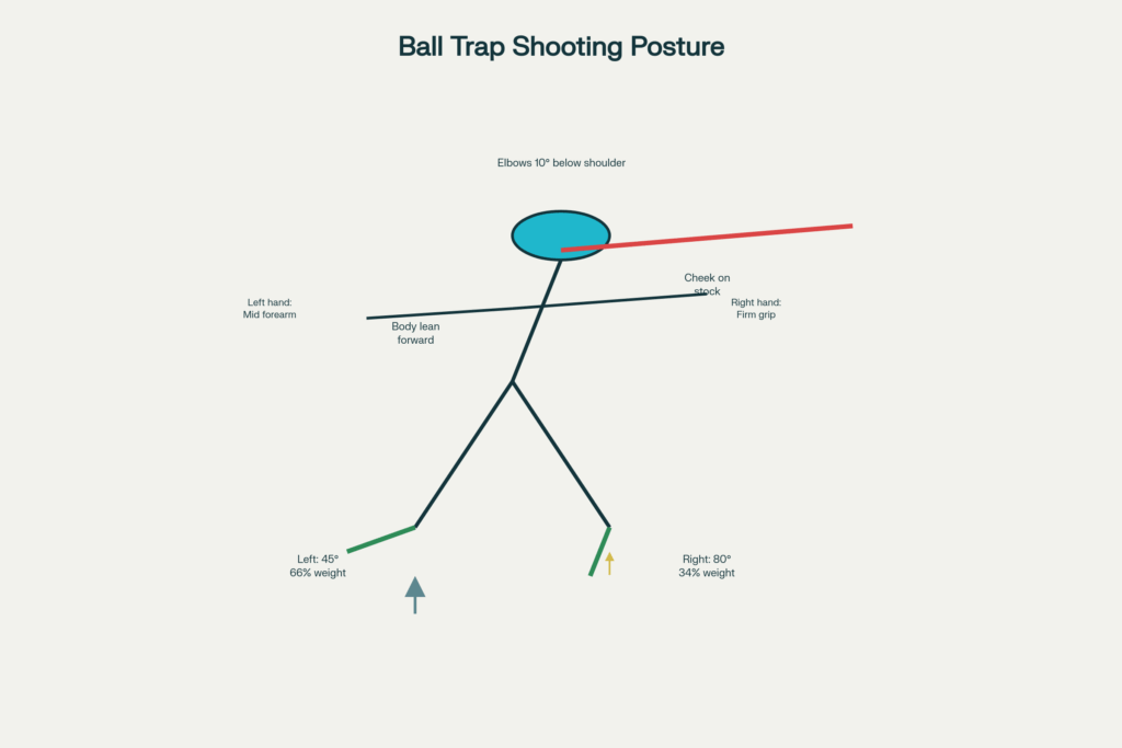 schéma de la posture correcte au ball trap position des pieds, répartition du poids et placement du corps