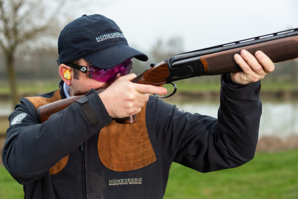 un tireur démontre la bonne position de l’épaule et le bon positionnement de l’arme pour un tir au pigeon d’argile précis.