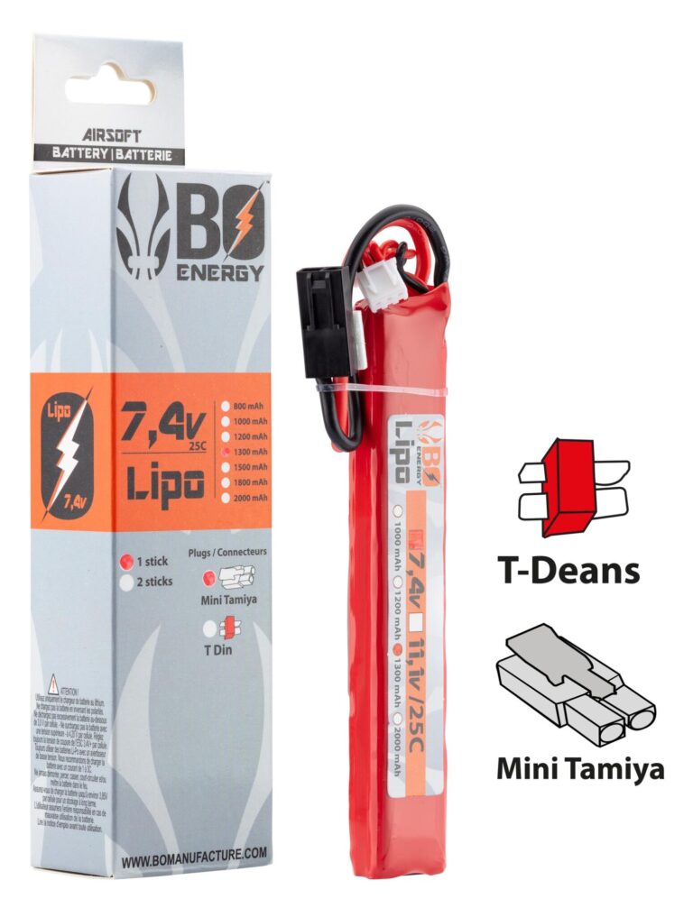 La réponse est oui : les batteries LiPo (Lithium Polymère) ont transformé les performances des AEG ces dix dernières années. Plus légères, plus compactes, avec une décharge plus stable et une cadence de tir supérieure, elles se sont imposées comme le standard chez les joueurs réguliers. La batterie LiPo 2S 7.4V 1300mAh 25C format 1 stick – Mini Tamiya (21,16 €) de BO Manufacture illustre parfaitement ce compromis entre performance, format compact et prix accessible.