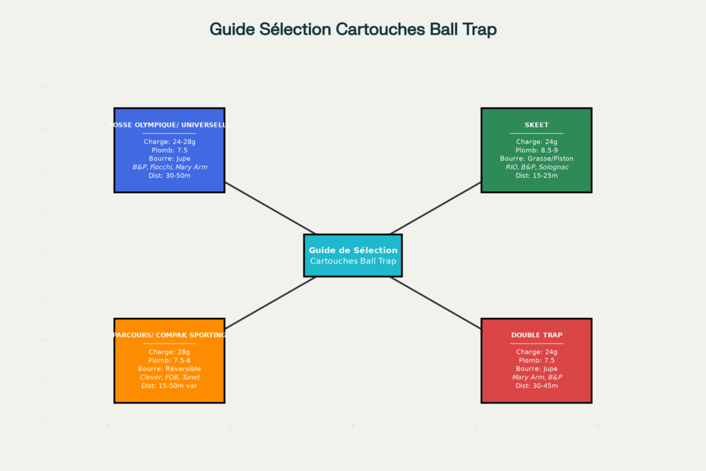 La Fosse Universelle , variante nationale autorisant 28 grammes, offre davantage de flexibilité. Les tireurs privilégient généralement du 28g plomb 7.5 bourre jupe pour les deux coups, bien que certains compétiteurs expérimentés optent pour du 7 en deuxième cartouche sur les plateaux fuyards. Le chokage typique oscille entre ½ et ¾ (voire Full pour le deuxième coup), resserrant la gerbe pour maintenir la densité à longue distance. Les marques recommandées incluent la B&P Competition One 24g , la Fiocchi Official 24g 7.5 , la Mary Arm Olympia Evo ou la Clever T3 Paris 2024 . Découvrez notre gamme complète de cartouches fosse olympique . La régularité première sur la vitesse pure, un plateau manqué en compétition pouvant décider d’un classement.