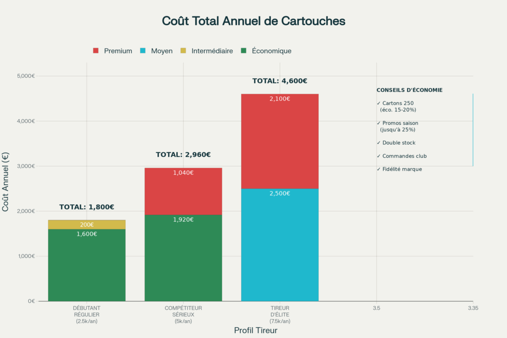 La stratégie de double stock – cartouches économiques pour l’entraînement, premium pour les compétitions – optimise le rapport coût/performance. Un tireur pratiquant 100 plateaux hebdomadaires (48 semaines/an) consomme environ 5000 cartouches annuelles. En répartissant 80% d’entraînement en gamme économique (4000 x 0.32€ = 1280€) et 20% de compétition en premium (1000 x 0.52€ = 520€), le budget total atteint 1800€ contre 2600€ en utilisant exclusivement du haut de gamme. Cette économie de 800€ annuels finance avantageusement un équipement complémentaire ou des frais de déplacement en compétition.