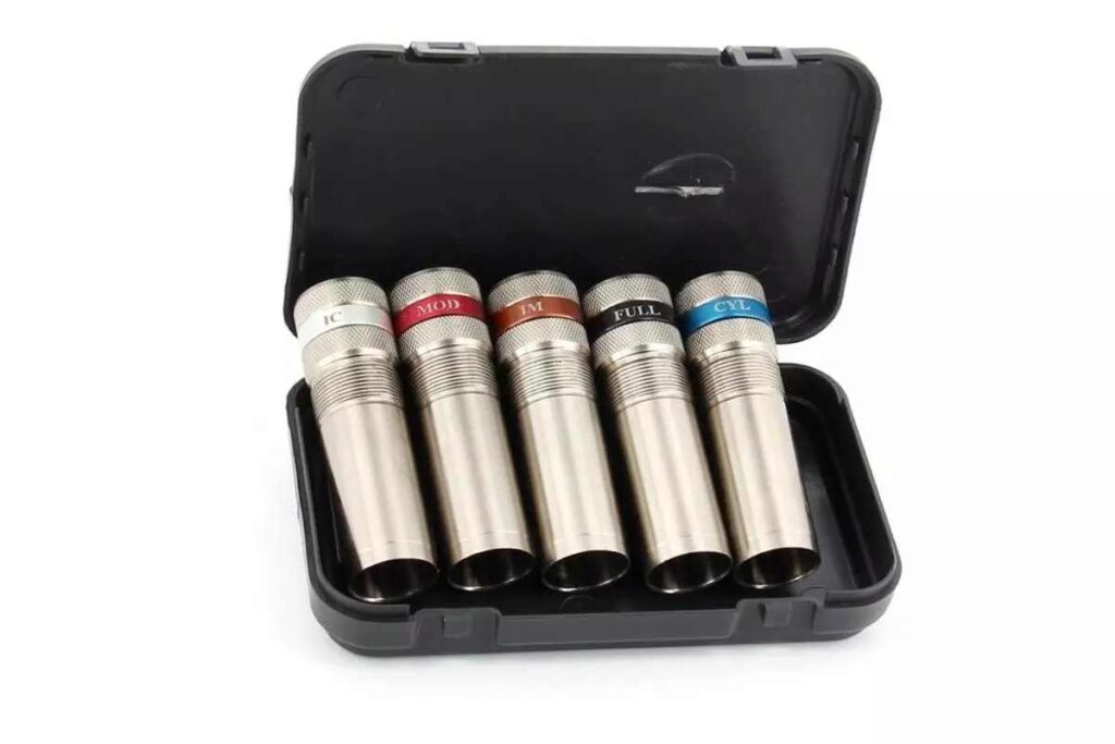 Ensemble de cinq chokes de fusil de chasse, étiquetés IC, MOD, IM, FULL et CYL, pour différentes dispersions de plombs en ball trap.