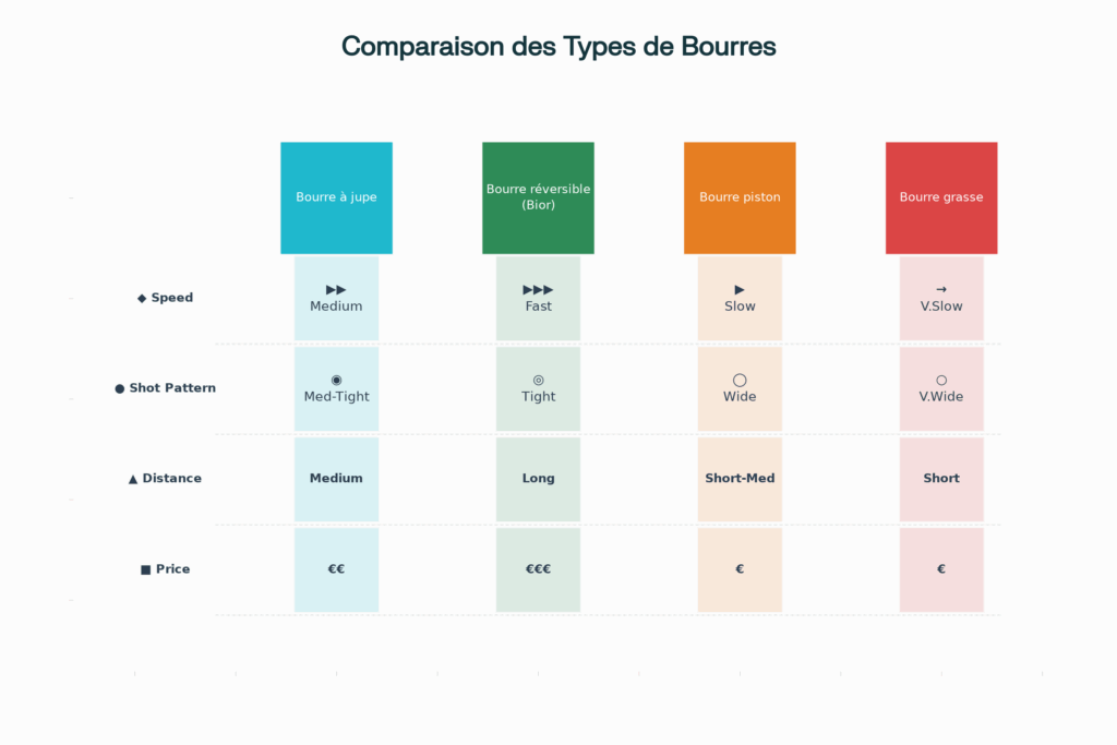 Comprendre les différents types de bourres demeure essentiel pour optimiser vos cartouches selon votre pratique. Le tableau ci-dessous synthétise les caractéristiques fondamentales de chaque type, révélant des différences substantielles en termes de vitesse, dispersion et utilisation recommandées.