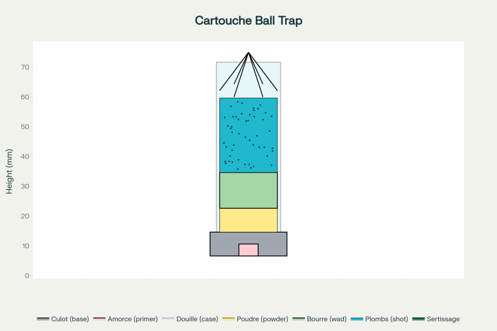 La cartouche de ball trap moderne est un concentré de technologie balistique dont chaque composant joue un rôle crucial dans la performance finale. La douille , généralement en plastique haute densité de 70 mm pour le calibre 12 standard, constitue l’enveloppe protectrice qui maintient l’ensemble des éléments. Le culot , mesurant entre 8 et 20 mm de hauteur, abrite l’ amorce qui déclenche la combustion de la poudre . Contrairement aux idées reçues, la hauteur du culot n’influence pas directement sur les performances balistiques mais relève davantage de considérations marketing, même si certains tireurs lui attribuent une stabilité accrue.