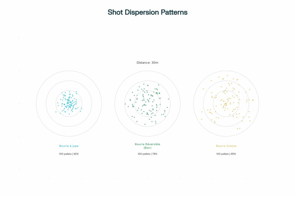 Cette comparaison révèle que chaque type de bourre optimise un contexte spécifique : la vitesse n’est jamais l’indicateur unique de qualité. La gerbe concentrée des bourres à jupe convient parfaitement aux tirages longue distance en fosse, tandis que la dispersion homogène périphérique de la Bior réversible augmente les probabilités de toucher sur erreur légère de cible.