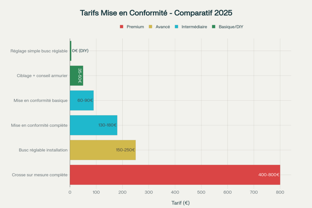 Le coût varie considérablement selon la nature des modifications nécessaires. Un simple ajustement de busc réglable que vous effectuez vous-même ne coûte rien. Une consultation avec ciblage chez un armurier s’établit à 35-50 euros. Une mise en conformité basique (ajout de semelles, remplacement plaque de couche) coûte 60-90 euros. Une modification complète avec travail du bois sous presse pour corriger pente et avantage nécessite 130-180 euros. L’installation d’un busc réglable sur un fusil qui en est dépourvu demande 150-250 euros. Enfin, une crosse entièrement sur mesure représente un investissement de 400-800 euros. La majorité des tireurs trouvent leur solution optimale dans la fourchette 60-180 euros.