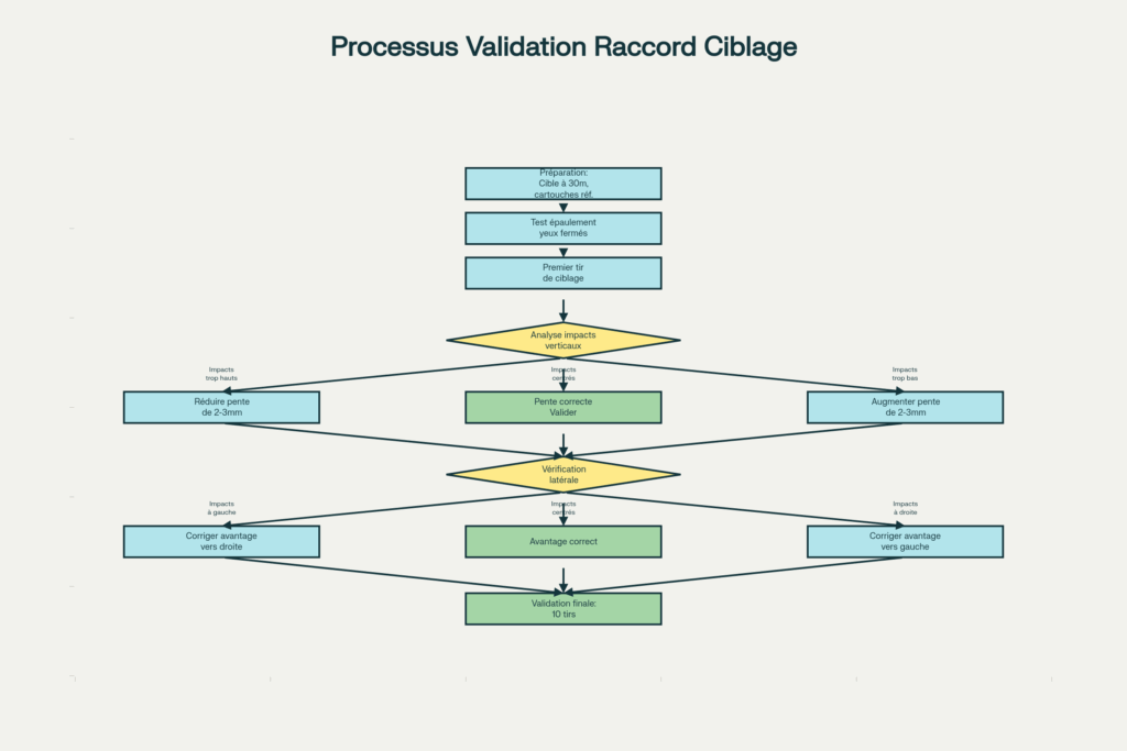 Le ciblage constitue la méthode incontournable pour valider objectivement votre raccord. Cette technique consiste à tirer sur une cible fixe à distance standardisée, généralement 30 mètres, pour analyser la position réelle de votre gerbe par rapport à votre point de visée.