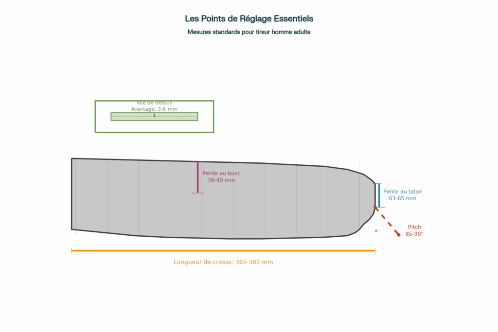 Deux valeurs définissent la pente : la hauteur au talon et la hauteur au busc. Pour un tireur masculin adulte de morphologie moyenne, les mesures standards se situent entre 63-65 millimètres au talon et 39-40 millimètres au busc. Les femmes nécessitent généralement des valeurs légèrement inférieures, autour de 58-62 mm au talon et 37-39 mm au busc.