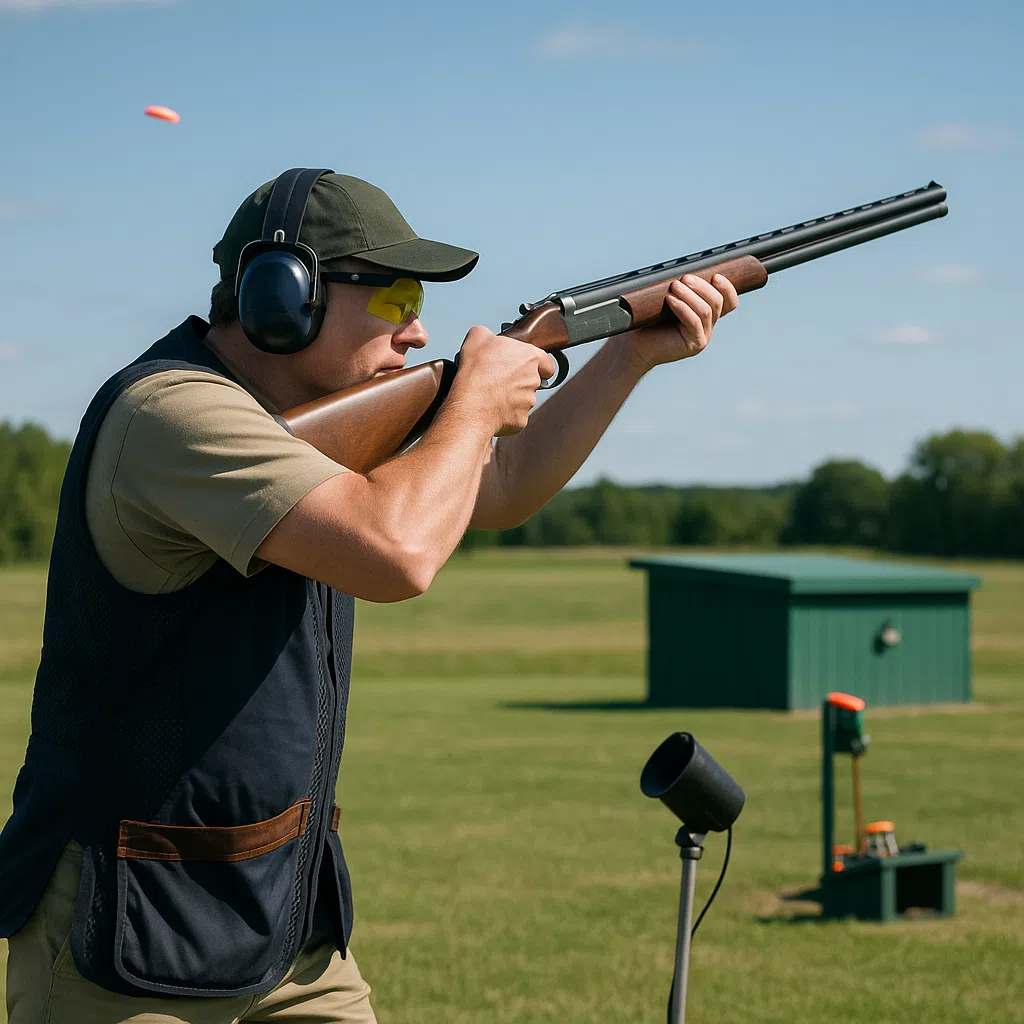 shooter in proper shoulder positioning (épaulement) aiming at clay target in ball trap shooting