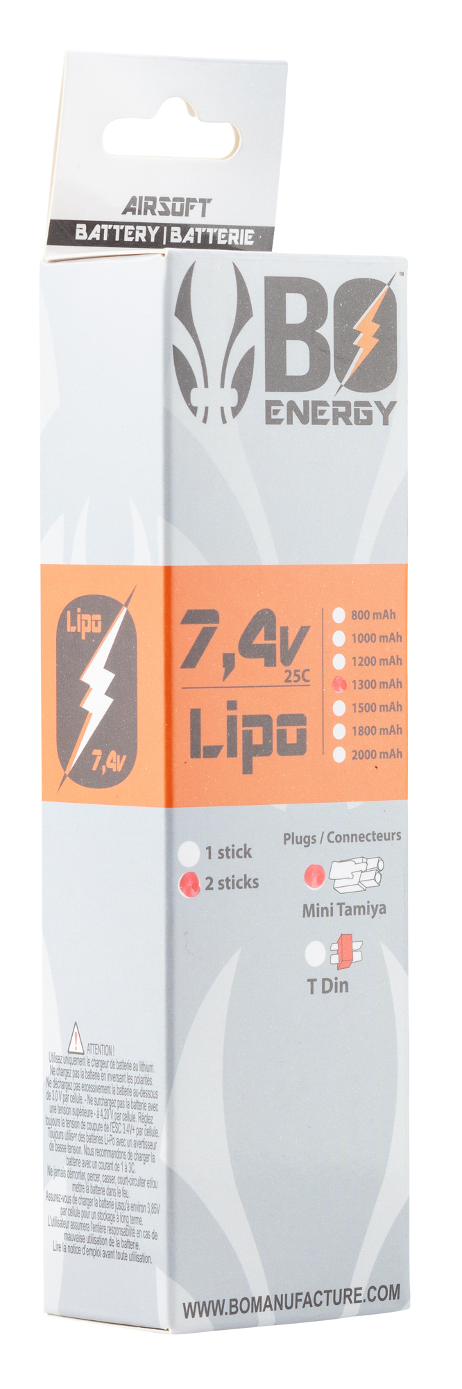 Le 2 sticks batterie Lipo 2S 7.4V 1300mAh 25C de BO MANUFACTURE est un produit pensé pour offrir des performances optimales dans le domaine du airsoft – batterie & fusibles.