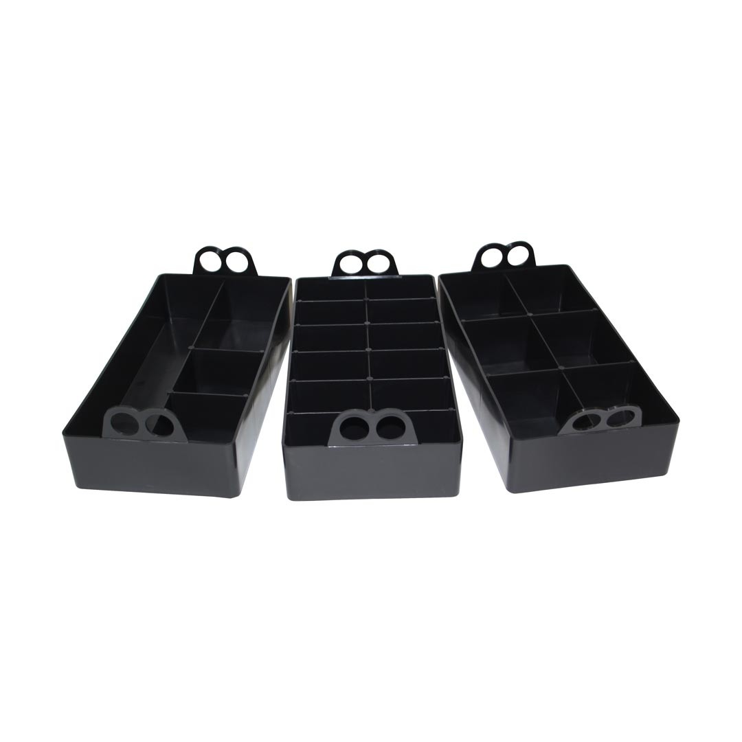 Un jeu de 3 plateaux d’organisation de boîtes de munitions en plastique qui transforme l’intérieur toute boîte de munitions en métal ou en plastique de calibre 50 en un organisateur à 22 compartiments. Ces plateaux empilables s’adaptent parfaitement