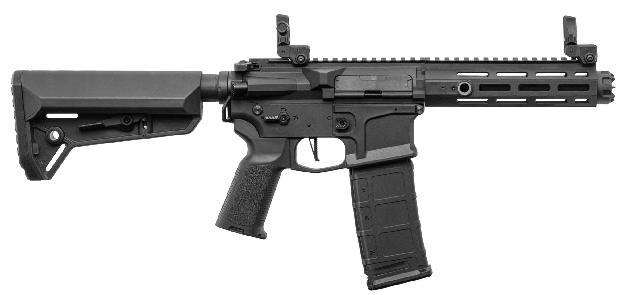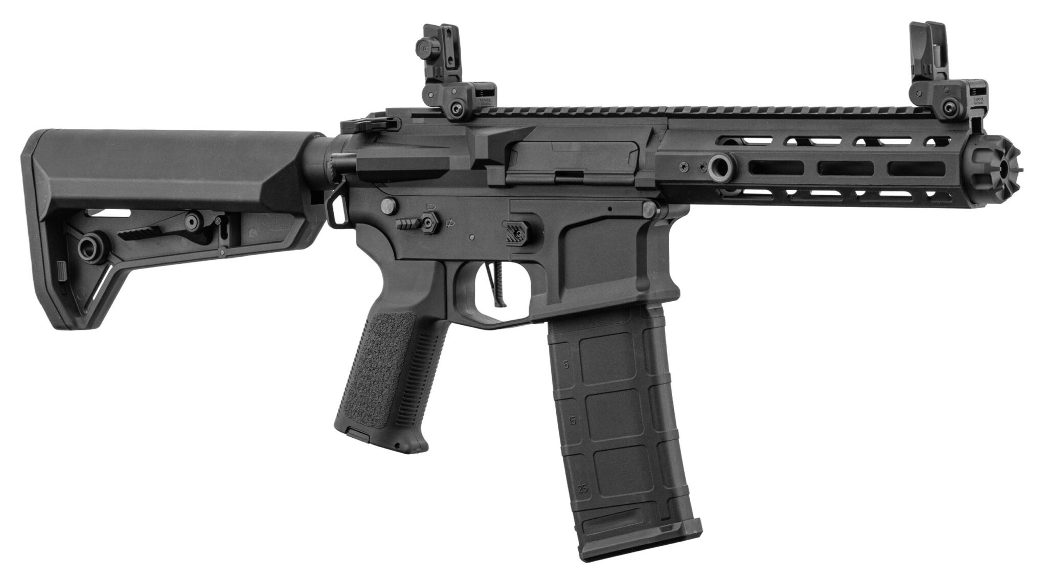 Très remarqué sur les terrains milsim pour son look unique, le Hellion séduit les joueurs qui cherchent à sortir du M4 classique sans sacrifier la compatibilité des pièces internes standard. Il se manœuvre facilement dans les couloirs CQB grâce à son garde-main court de 7 pouces.