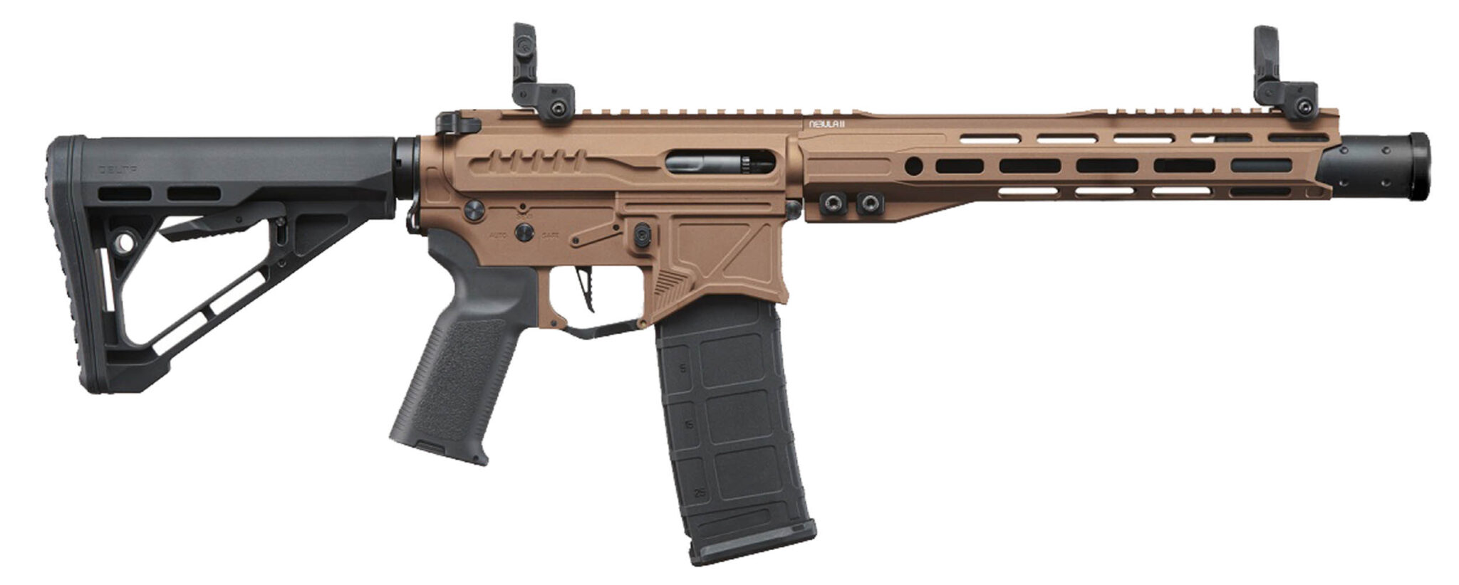 Réplique airsoft AEG Zion Arms Nebula II GEN4 10 pouces bronze, 1 joule. Polyvalente extérieur, motorisation GEN4 régulière et fiable. Réf. LE9058.