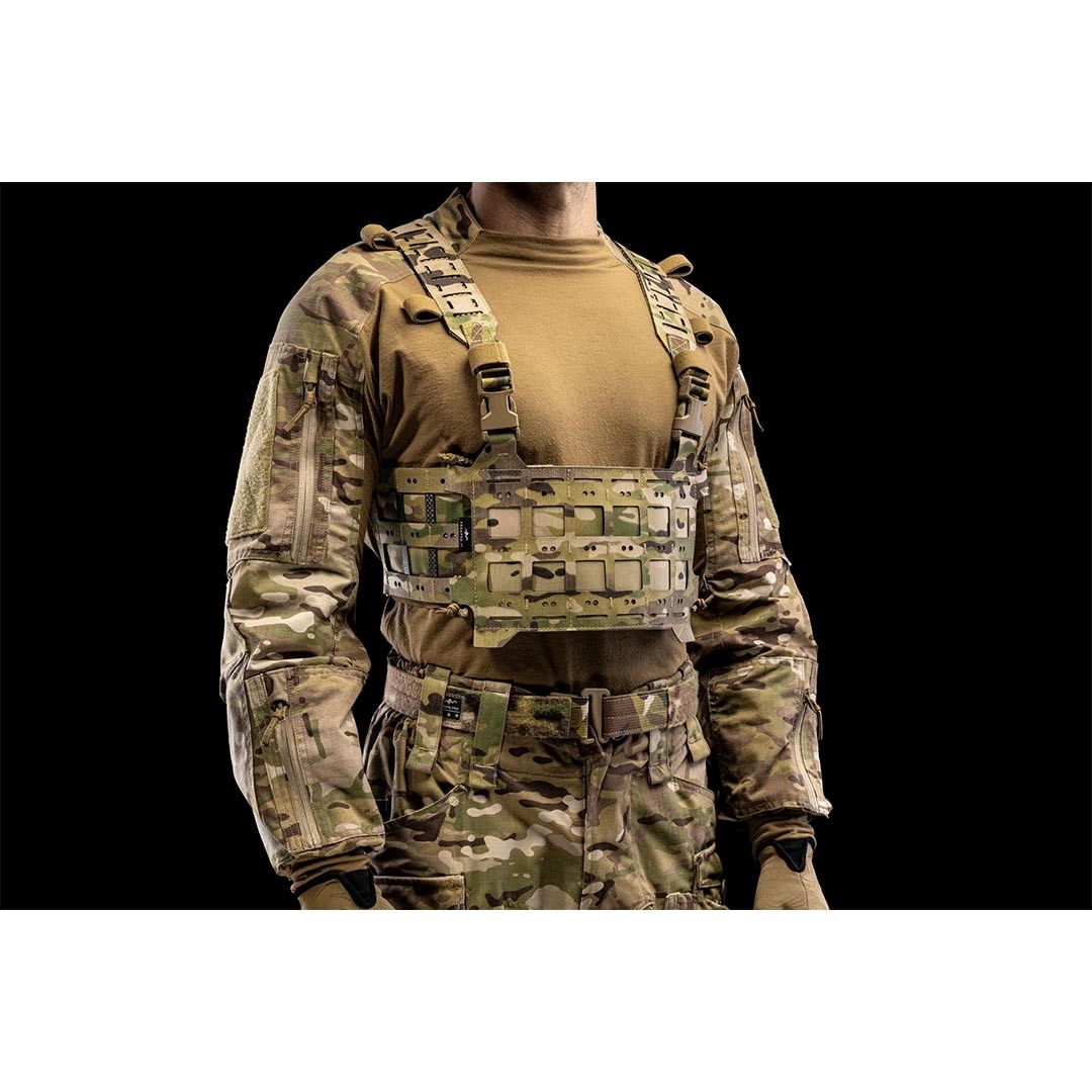 Le système Multi-Dot MOLLE PALS exclusif permet la fixation de poches et d’accessoires tout en offrant la possibilité d’ajouter des cordons pour sécuriser câbles, chemlights ou tourniquets. L’intérieur est doublé de Velcro® Velour, permettant la fixation d’inserts internes, et le kit inclut 4 cordons élastiques ITW Nexus® GT Tactical pour garantir la stabilité du chest rig, même en torsion. Points forts Compatible avec tous les micro chest rigs Ajoute 3 colonnes MOLLE PALS de chaque côté pour plus de modularité Structure en Tegris® technopolymère : rigide, légère et durable Revêtement extérieur en LAHYCO® déperlant, ignifuge et conforme IR Doublure intérieure en Velcro® Velour pour inserts radio ou chargeurs Système Multi-Dot MOLLE PALS pour ajout d’accessoires et câblage 4 cordons ITW Nexus® GT Tactical inclus pour fixation renforcée Conception professionnelle pour configurations tactiques évolutives Caractéristiques principales Compatibilité : tous micro chest rigs Capacité : 3 colonnes MOLLE PALS par côté Structure : Tegris® technopolymère Revêtement extérieur : tissu composite LAHYCO® (Cordura® 500D + Hypalon®) Intérieur : Velcro® Velour (Velcro® Brand) Système : Multi-Dot MOLLE PALS FROG.PRO® Poids : 120 g (paire) Couleur : Multicam® Contenu de la boîte 1 paire d’Extension Si