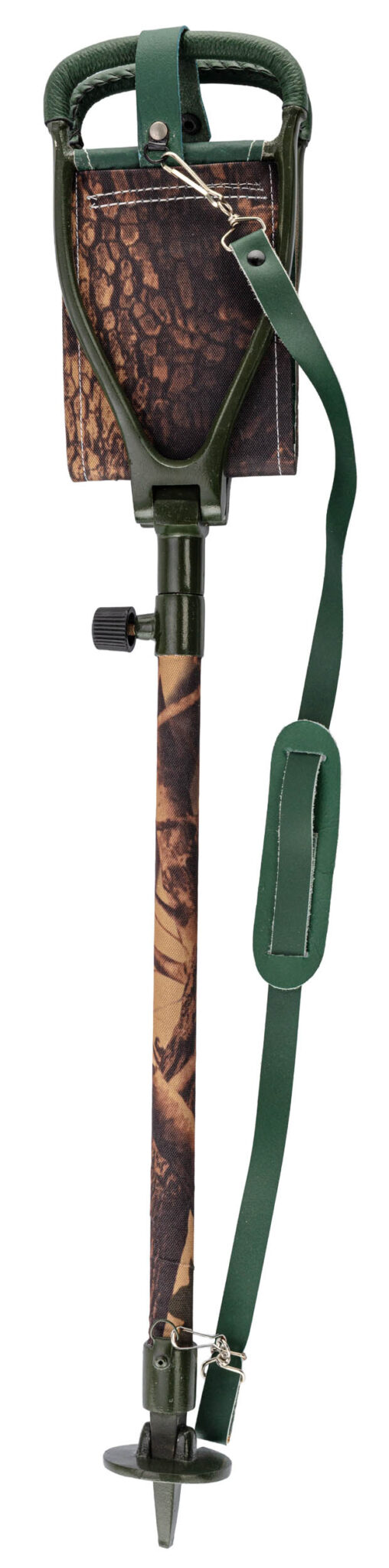 Pied et structure en métal avec platine anti enfoncement. Assise en cuir de 30 x 11.5 cm Poignées et pied gainés camo Réglable de 59 à 81 cm