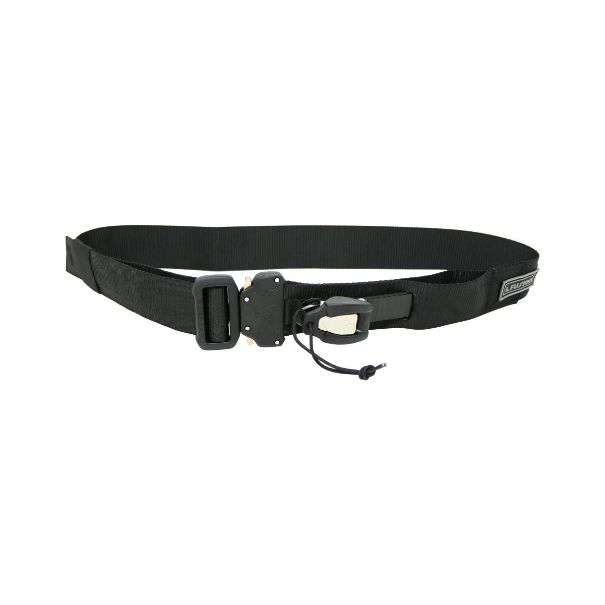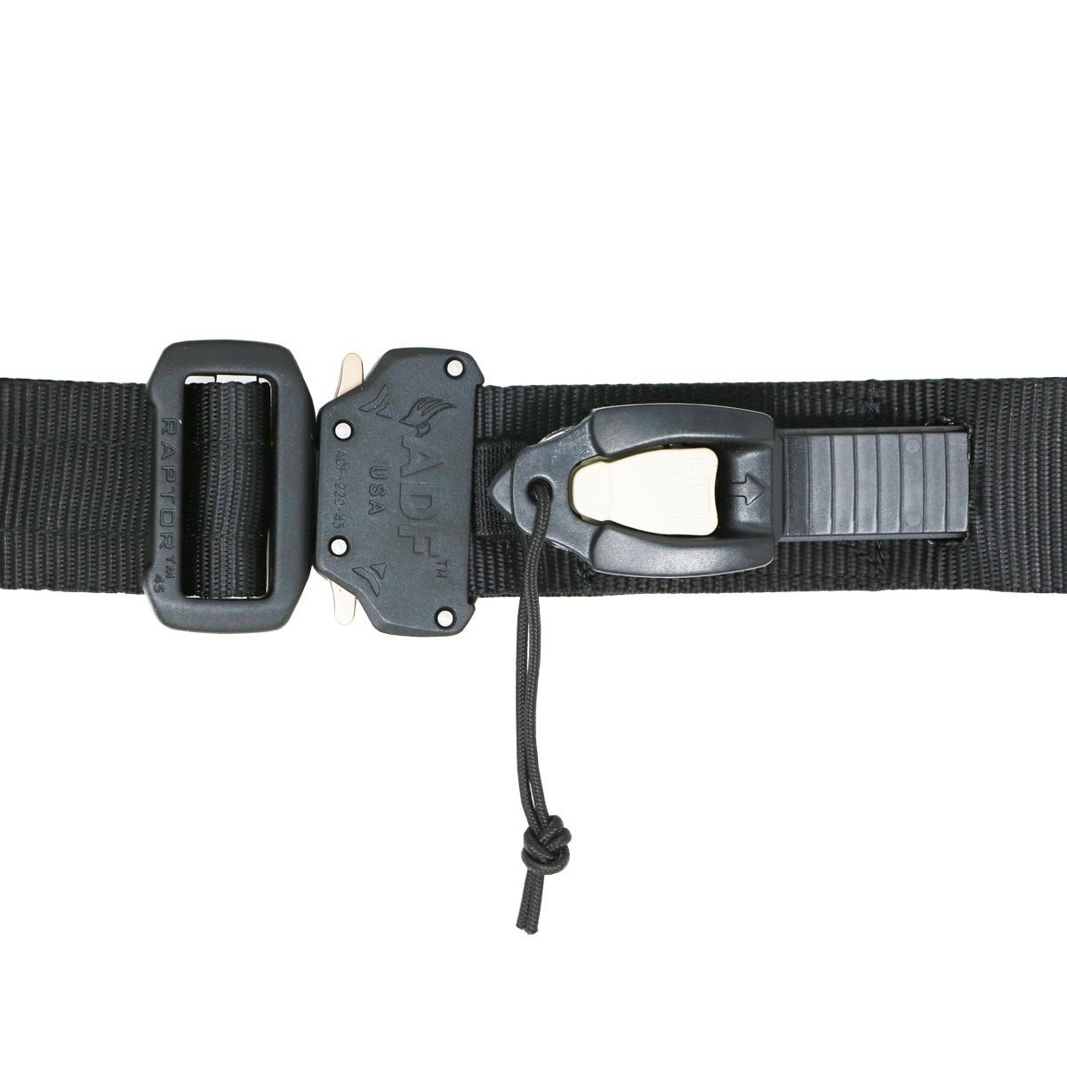 La ceinture complète comprend une boucle de fermeture à clips ADF-USA (18 kN de résistance). La languette crantée du garrot est dans une version noire pour plus de discrétion.