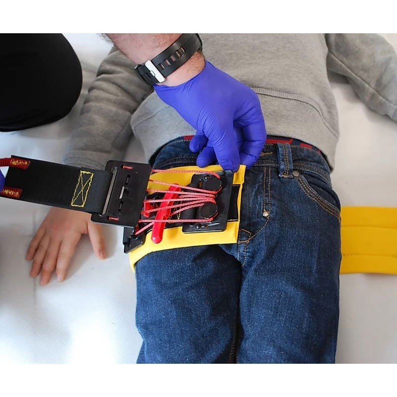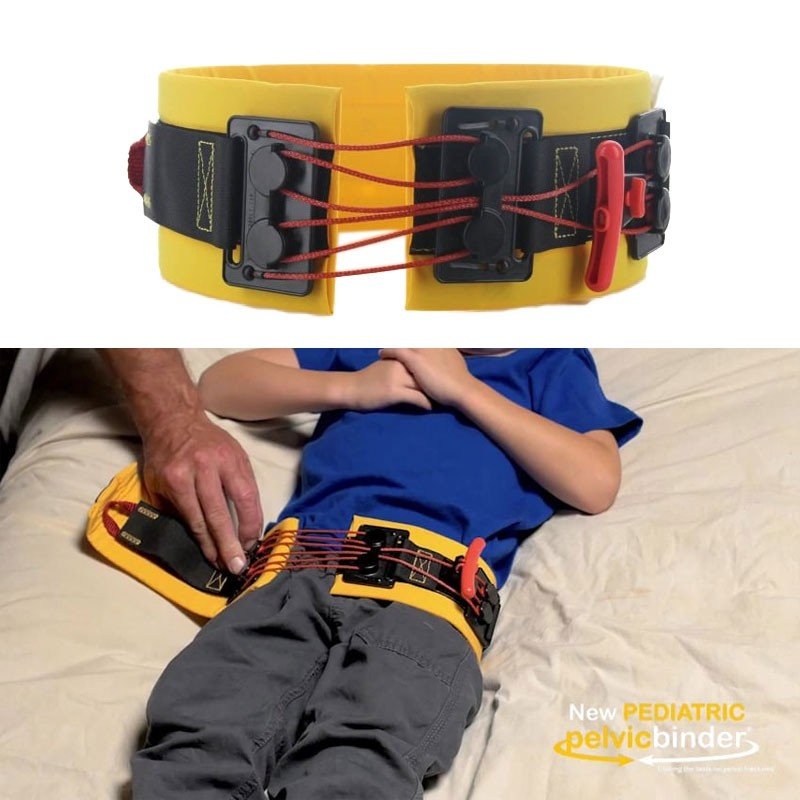 Ceinture pelvienne pédiatrique Pelvic Binder® — Ceinture Pelvienne de couleur jaune conçue pour les enfants. Normée CE, elle permet de stabiliser les fractures du bassin et elle peut être appliquée sur un enfant avec une circonférence pelvienne de 35 cm à 84 cm. Utilisation intuitive et rapide, mais surtout un gain de place important par rapport.