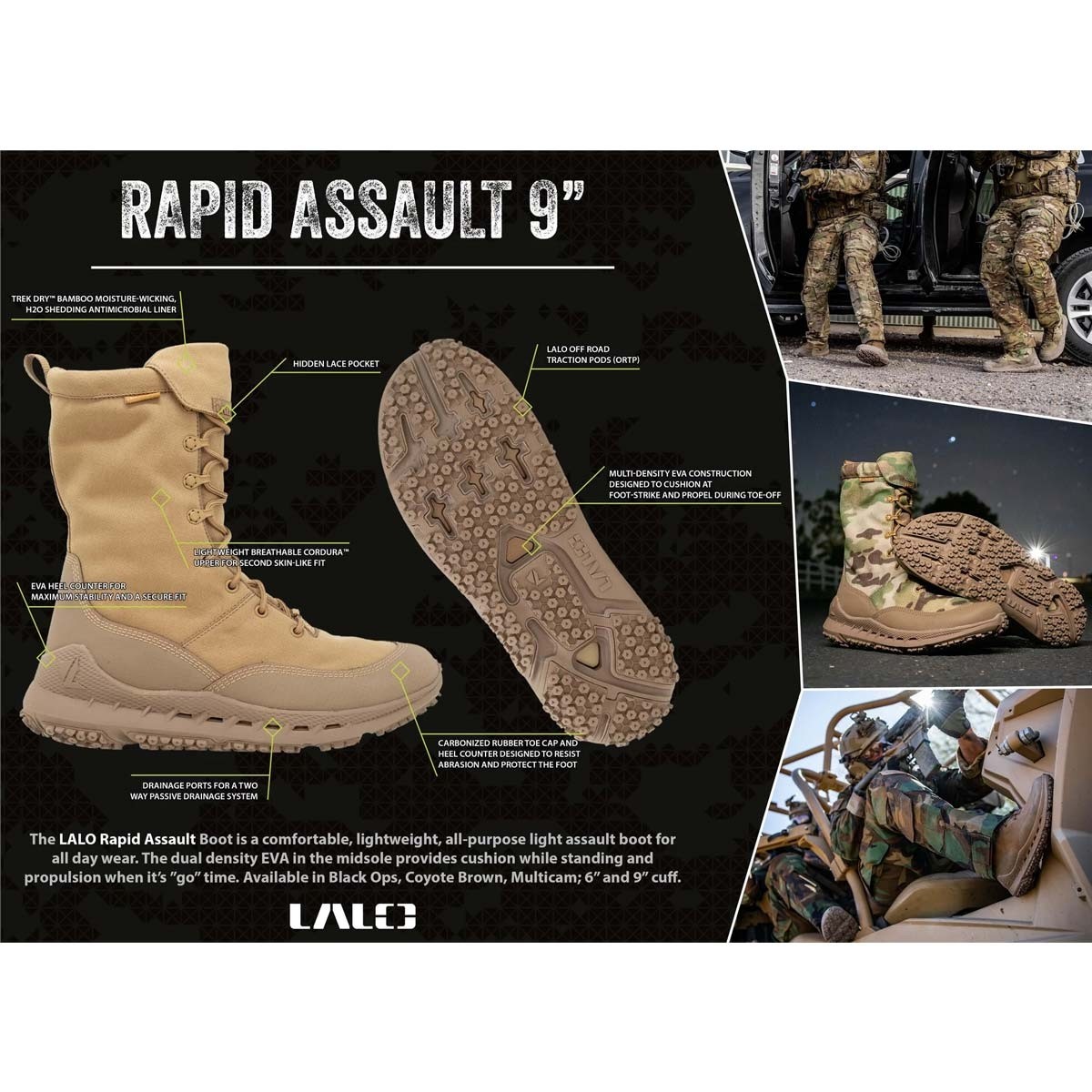 La Rapid Assault est adaptée pour se déplacer sur tous les terrains sur lesquels le poids est important et où la vitesse et la flexibilité sont nécessaires. Elle excelle sur les sentiers, les substrats mixtes et les routes. Caractéristiques Chaussure d’intervention polyvalente Légère, respirante et drainante Système de drainage de l’eau double sens Bout du pied renforcé pour la protection et limiter l’abrasion Poche pour ranger et cacher les lacets Œillets fermés LALO OCF – Operator Component Fit System Doublure respirante antimicrobienne et hydrophobe Semelle d’accroche en caoutchouc moulé par injection antidérapante Pods de traction antidérapants LALO Off-Road Traction Pods (ORTP) Forme articulée du talon et de la semelle extérieure pour un déroulé du pied furtif et silencieux Plaque composite résistante à la perforation avec rotation pour la protection et limiter la fatigue Semelle intermédiaire EVA multi-densité conçue pour amortir l’impact du pied et propulser lors du décollage du talon Hauteur du talon à l’orteil : 5 mm de dénivelé actif Tige en Nylon Cordura® 1000D et doublure TEK-DRY™ Hauteur 9″ Poids (44/10us) : 538 g Pointure US Coloris : Marron Coyote Brown (COY) * Pour un meilleur ajustement, LALO recommande de prendre 1/2 taille au-dessus des produits similaires La Rapid Assault est adaptée pour se déplacer sur tous les terrains sur lesquels le poids est important et où la vitesse et la flexibilité sont nécessaires. Elle excelle
