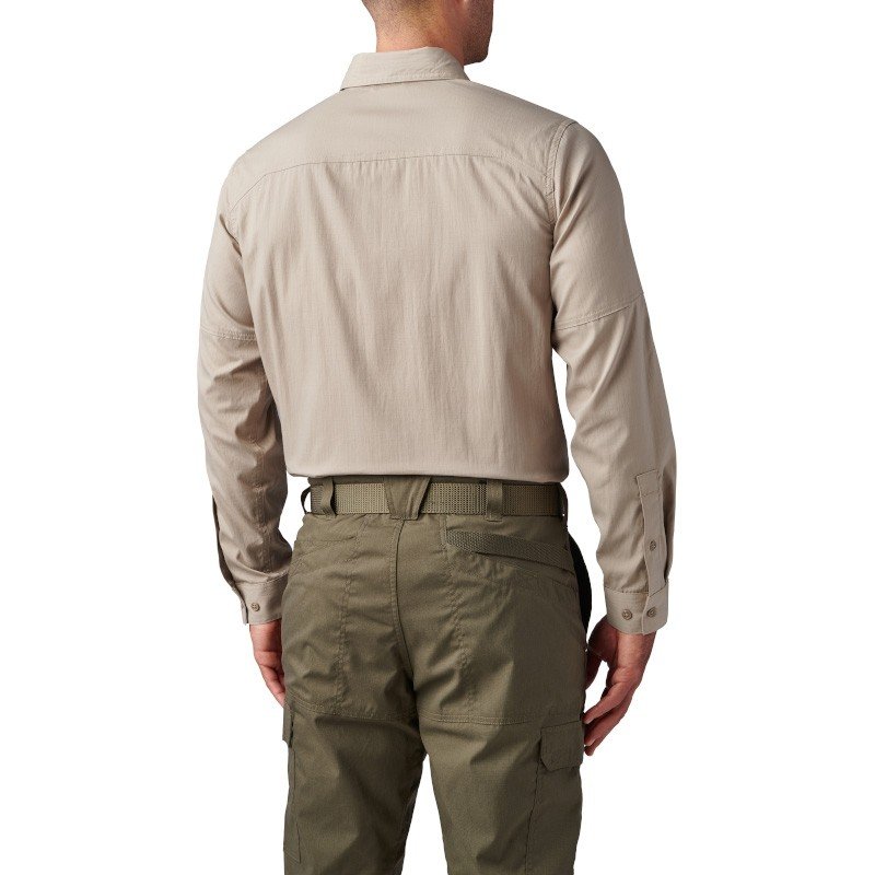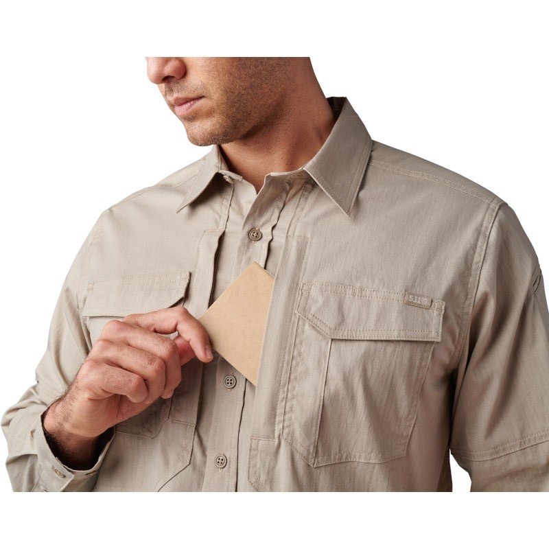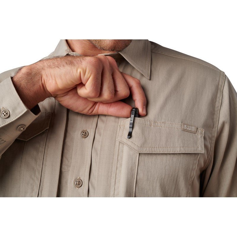 La poche à stylo sur le haut de la manche gauche est spécifiquement conçue pour recevoir des broderies (nom, grade, unité). L’étiquette tissée 5.11[+] sur la poche poitrine gauche témoigne également de la qualité de fabrication.