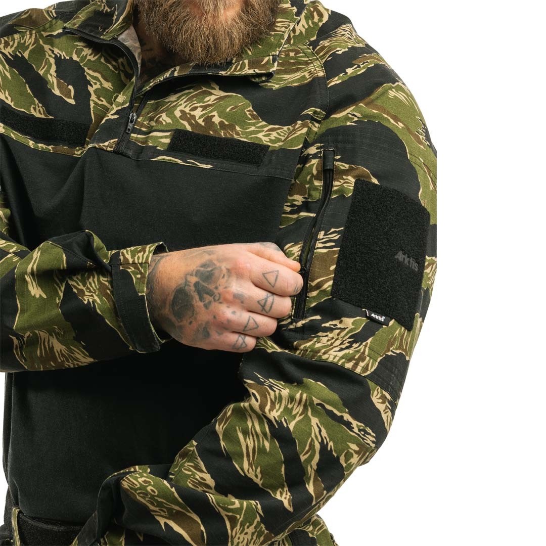 La Chemise combat A110 All Climate Tiger Stripe Arktis Elite est fabriquée en 50/50 Poly/Coton MiniRip stop (200 gr/m²) Coloris : Authentique camouflage Tiger Stripe™ * Caractérisé par un motif distinct de bandes. Cette composition garantit un équilibre entre résistance, légèreté et confort pour une utilisation intensive.