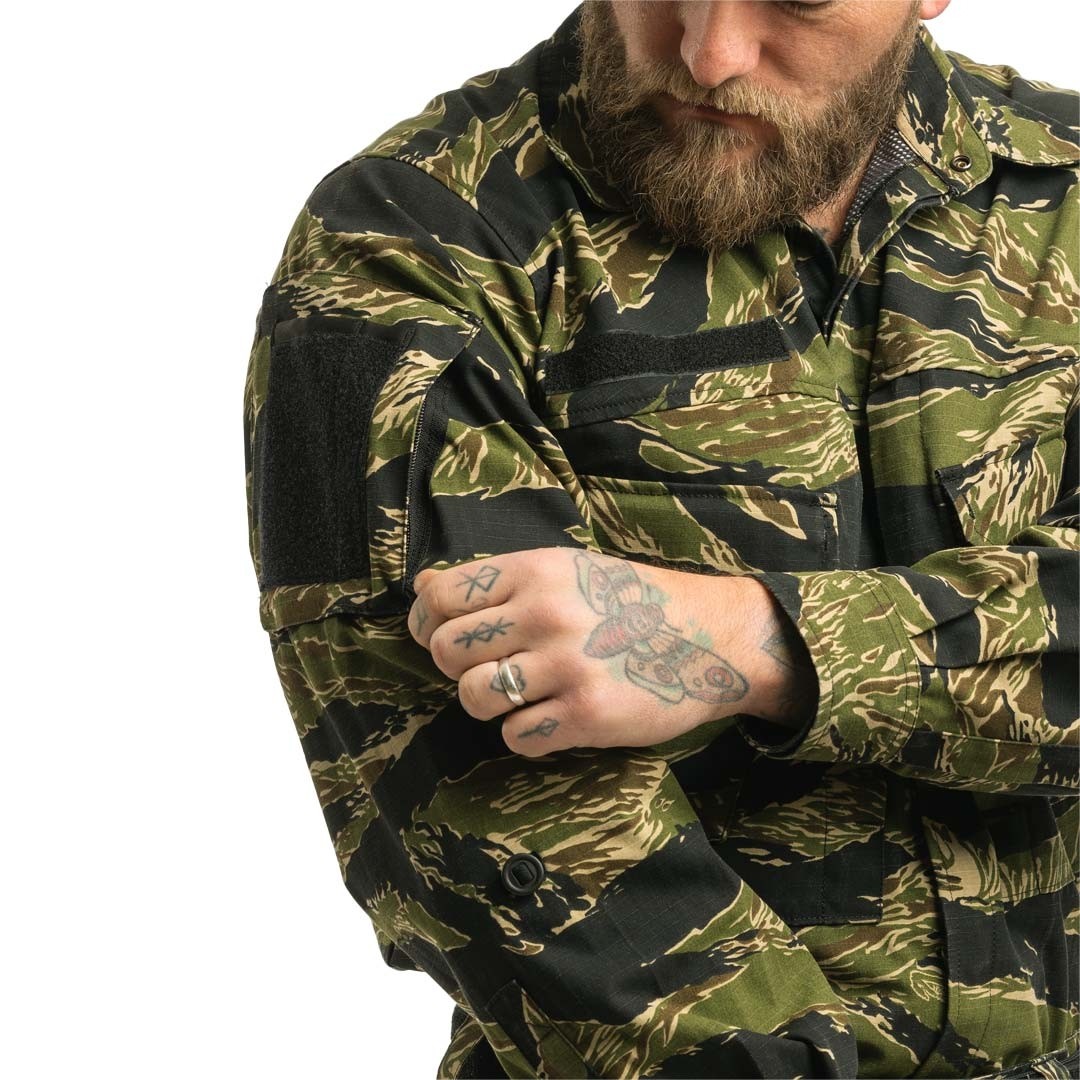 La Chemise combat A110 All Climate Tiger Stripe Arktis Elite est fabriquée en 50/50 Poly/Coton MiniRip stop (200 gr/m²) Coloris : Authentique camouflage Tiger Stripe™ * Caractérisé par un motif distinct de bandes. Cette composition garantit un équilibre entre résistance, légèreté et confort pour une utilisation intensive.