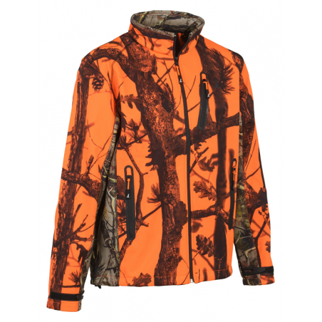 Softshell triple couche, tissu extérieur 96% polyester, 4% élasthanne, membrane polyuréthane, imperméable et respirante. Tissu intérieur polaire 100% polyester. 1 poche poitrine zippée, 2 poches repose-mains zippées, cordon de serrage à la taille, capuche intégrée au col, carnier avec doublure étanche et lavable. Normé CE.