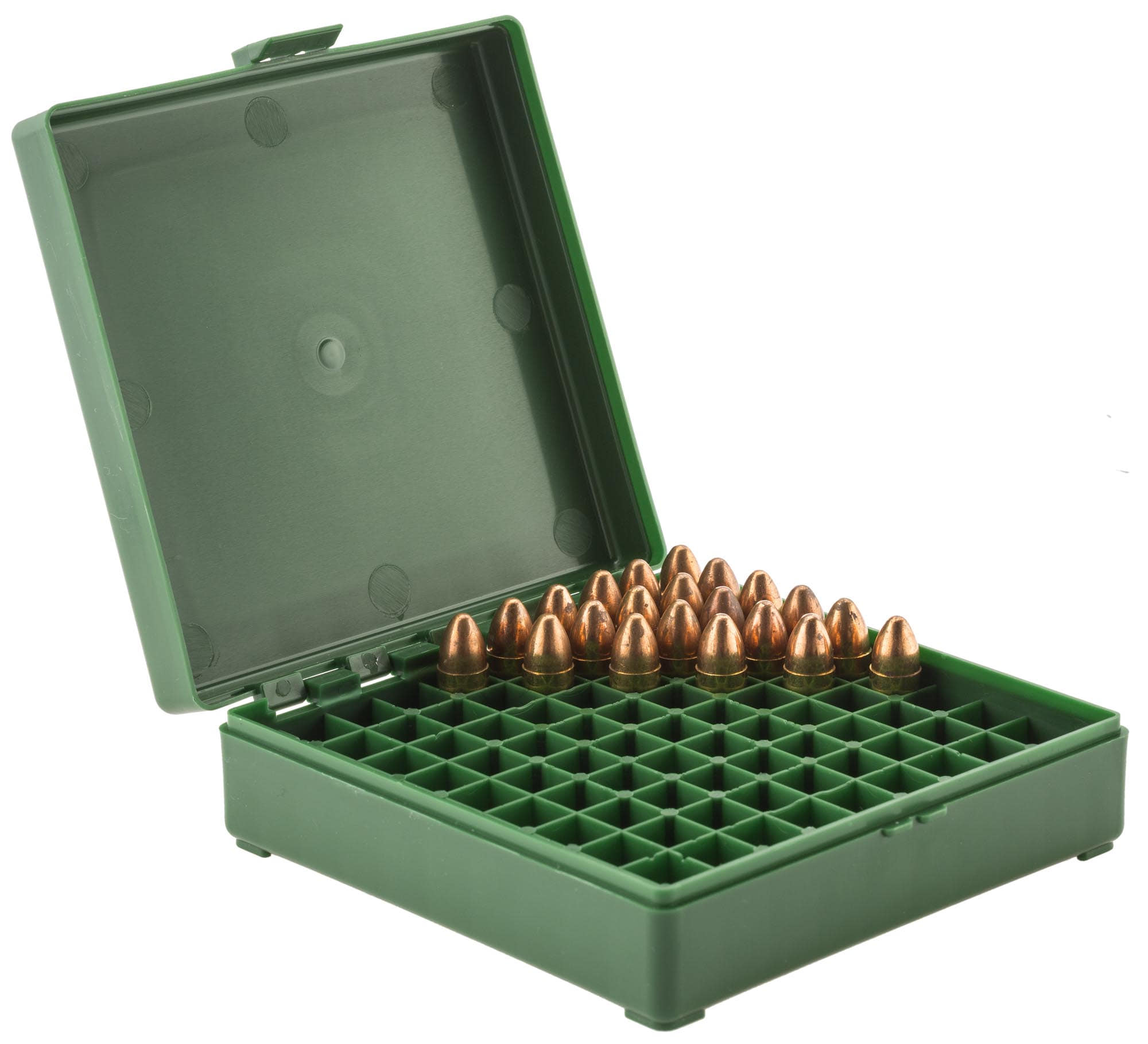 Boîte en plastique Mégaline pour le stockage ou le transport de munitions. Compatible : 9×19 Luger, 380 ACP, 9×18 mm, 9×21 mm. Compartiments de 10 x 10 mm – Hauteur utile : 31 mm.