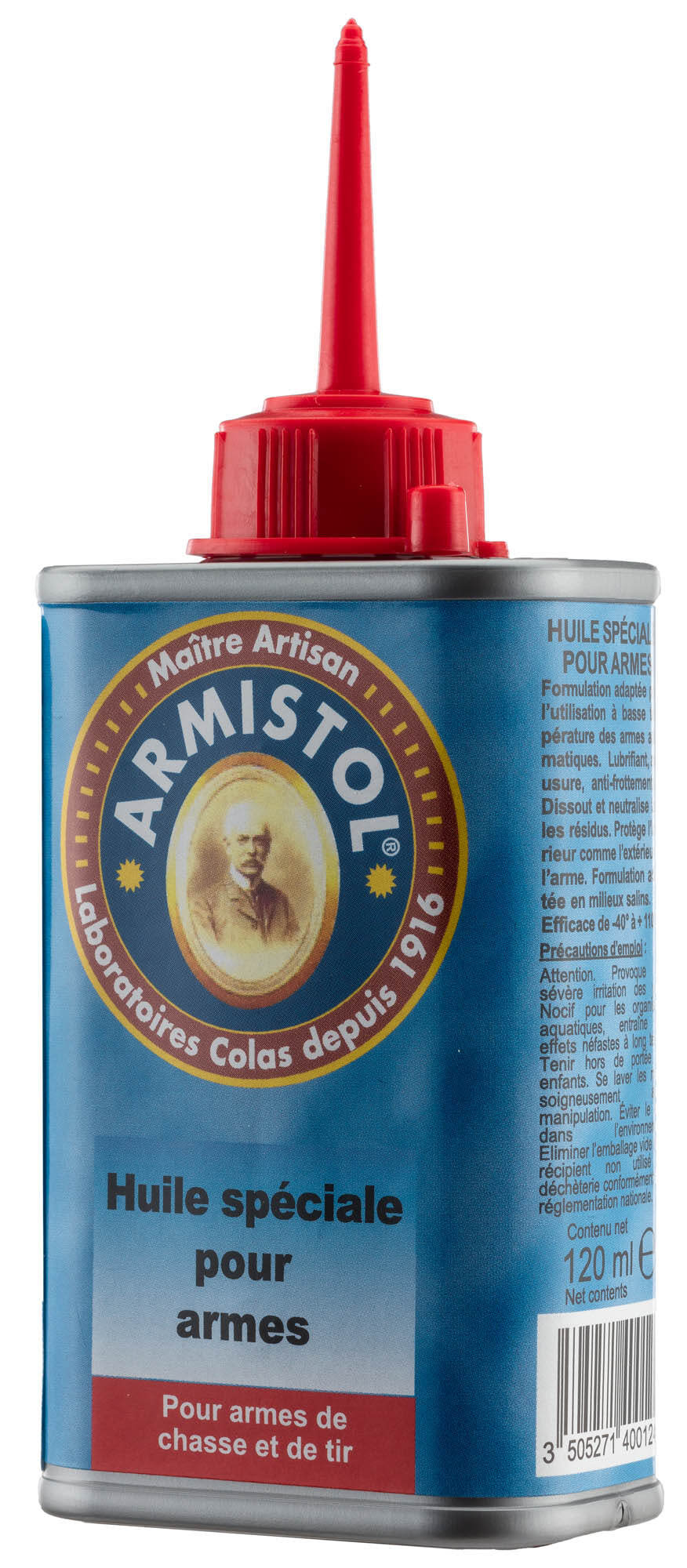 Burette d’huile 3 en 1 de la marque Armistol, contenance 120 ml. Produit anticorrosif, antirouille et lubrifiant idéal pour l’entretien des armes de chasse et de tir. Conditionnement par carton de 25 burettes. Fabriqué en France. Prix public à l’unité indiqué.