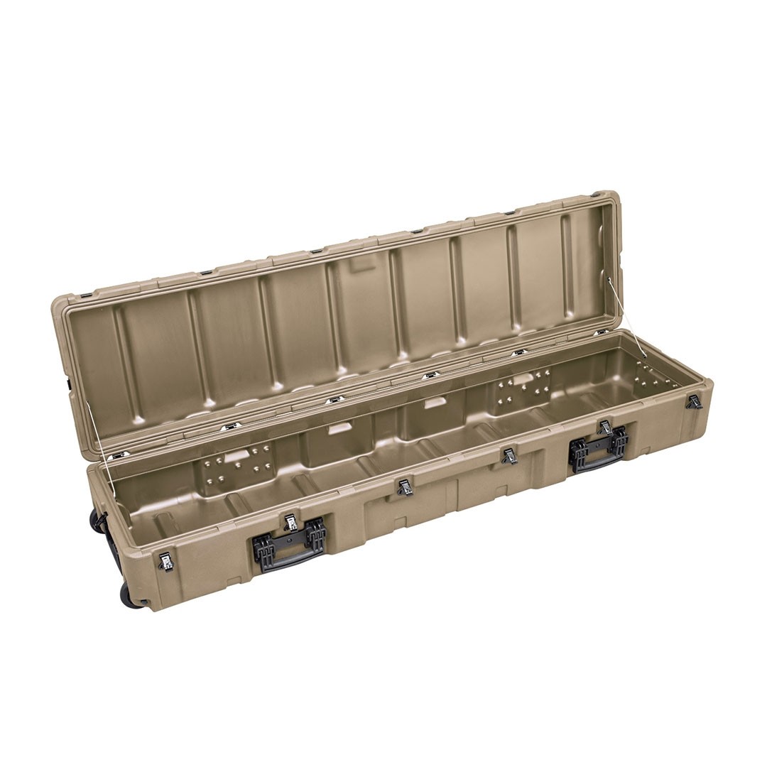 Valise rigide très solide en polyéthylène haute densité réalisée par rotomoulage. Elle possède un joint en PU, un couvercle à charnière avec des supports en acier et 6 poignées pliantes encastrées pour un transport facilité, y compris en cas de valise pleinement chargée.