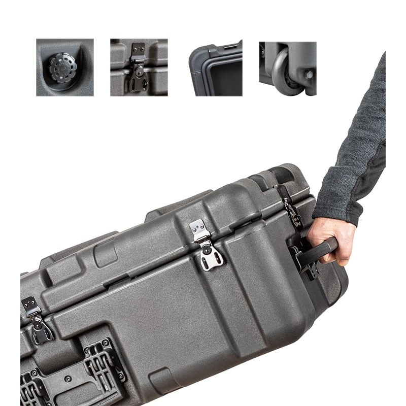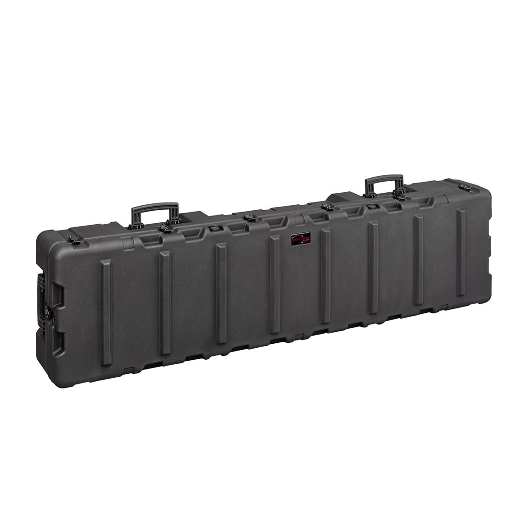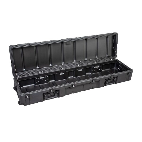 Valise rigide très solide en polyéthylène haute densité réalisée par rotomoulage. Elle possède un joint en PU, un couvercle à charnière avec des supports en acier et 6 poignées pliantes encastrées pour un transport facilité, y compris en cas de valise pleinement chargée.