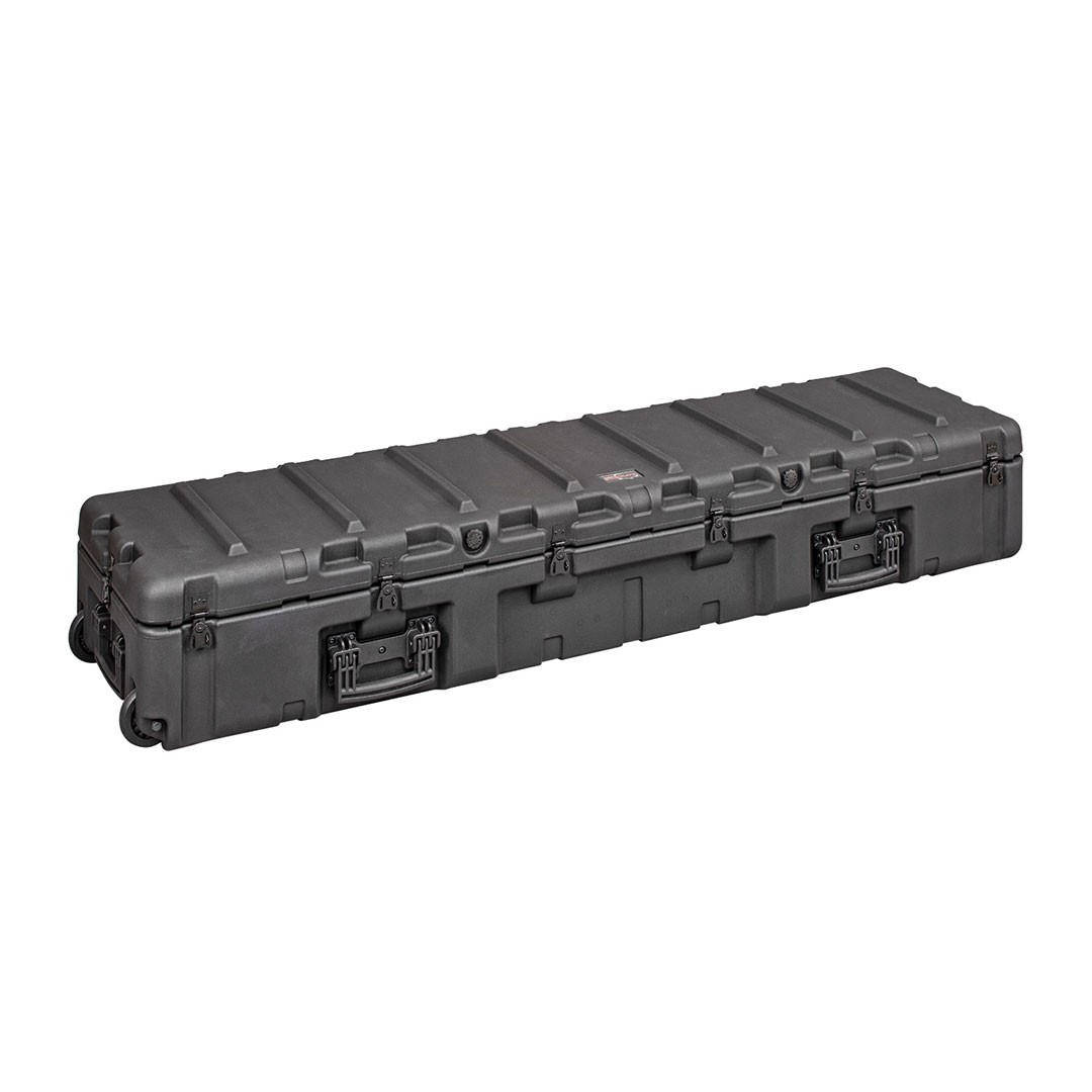 Valise rigide très solide en polyéthylène haute densité réalisée par rotomoulage. Elle possède un joint en PU, un couvercle à charnière avec des supports en acier et 6 poignées pliantes encastrées pour un transport facilité, y compris en cas de valis