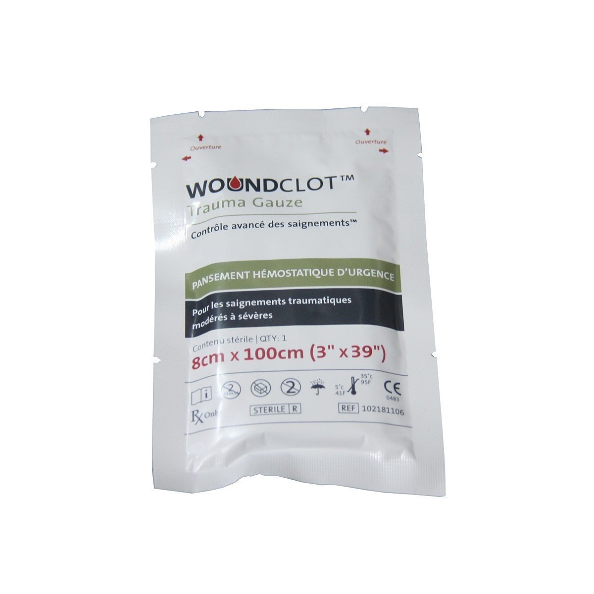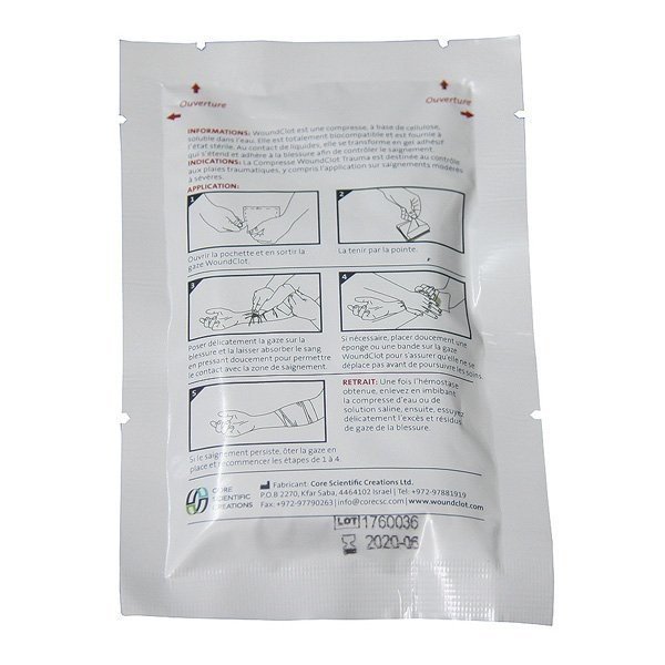 Le WoundClot Trauma Gauze est destiné au contrôle des saignements des plaies traumatiques, y compris des applications de saignements modérées à sévères. Les pansement Woundclot ont été choisis et sont en dotation : US Air Force, FBI, NYPD, Armée polonaise, turque et italienne, services de secours roumains et hongrois. Classe IIb marquage CE Rapide et sans contre pression Video