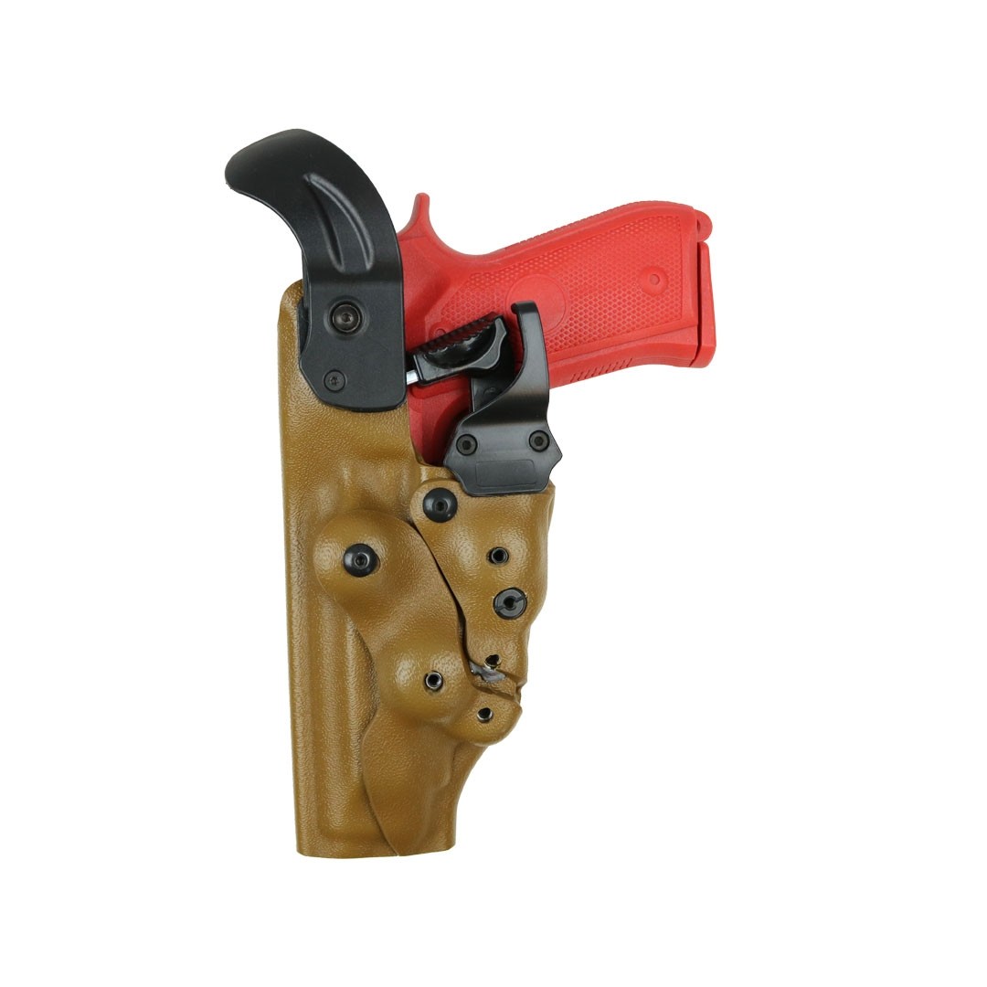 Les dispositifs supplémentaires STR, Roto Guard et BS-pro renforcent la protection de la détente, du pontet et du chargeur, assurant une sécurité accrue contre toute manipulation accidentelle ou tentative d’arrachement. Compatible avec les systèmes de fixation Multilink 1, l’holster peut être monté sur divers supports (plaque de cuisse, passant de ceinture, griffe MOLLE, etc.) selon les besoins opérationnels. 5 niveaux de rétention indépendants pour une sécurité optimale Dégainage rapide et intuitif grâce au système 2 Fast (Evolock-s + Rotoloop-s) Systèmes additionnels STR, Roto Guard et BS-pro pour une protection renforcée Compatible avec les supports Multilink 1 Conception robuste et légère en Kydex moulé Disponible en version droitier et gaucher Idéal pour les forces de l’ordre et la sécurité professionnelle Modèle : 2 Fast D-Shell T-LEP Compatibilité : Beretta 92 / 98 / PAMAS G1 Niveau de sécurité : 5 niveaux de rétention Systèmes automatiques : Evolock-s + Rotoloop-s Systèmes additionnels : STR, Roto Guard, BS-pro Fixation : Port System Multilink 1 (supports en option) Orientation : Droitier ou Gaucher Matériau : Polyform (Kydex) Poids : 302 g Couleur : Coyote Brown (463)