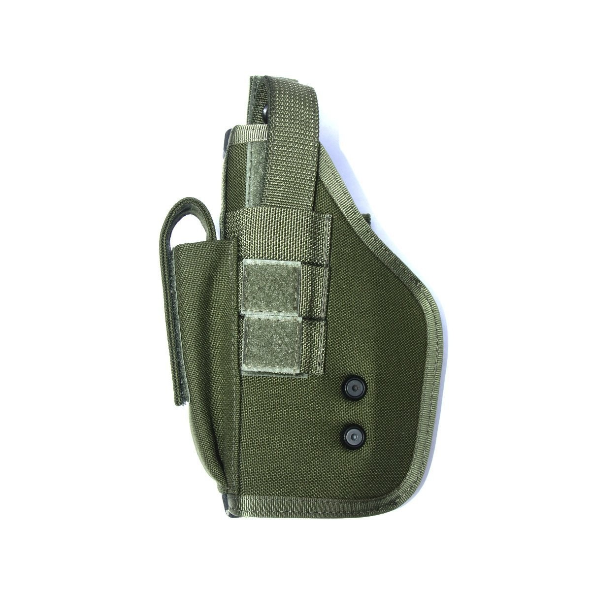 Voici un Holster MOLLE simple et universel (pour gaucher) qui peut accueillir tout type d’arme de poing équipée ou non d’une lampe ou d’un désignateur laser. Cela est possible grâce à un dispositif qui permet de régler l’espace intérieur de l’étui. Il est équipé du système d’attache MOLLE et d’une poche fermée par un système auto agrippant réglable permet aussi bien l’emport d’un chargeur de rechange de 15 cartouches, d’un couteau ou encore d’une lampe.
